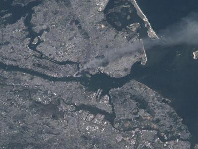 2001年9月11日上午,在国际空间站拍摄的被飞机撞击后的纽约世贸大楼。