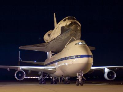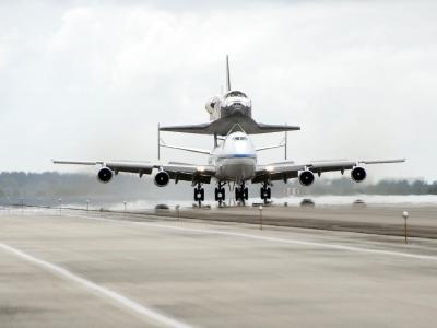 2009年9月20日,爱德华兹空军基地的跑道上,波音747客机背着发现号航天飞机。