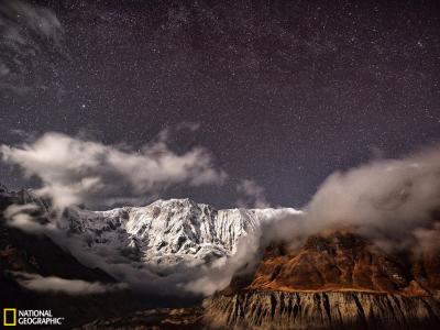 满月在尼泊尔安纳普尔纳峰基地营上空升起