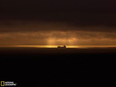 一艘巨轮穿过胡安·德富卡海峡 一艘巨轮正穿过胡安·德富卡海峡。该海峡位于不列...