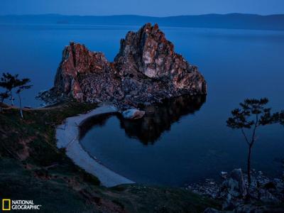 俄罗斯西伯利亚贝加尔湖 Burkhan岩矗立在俄罗斯西伯利亚贝加尔湖边,如同双尖塔...