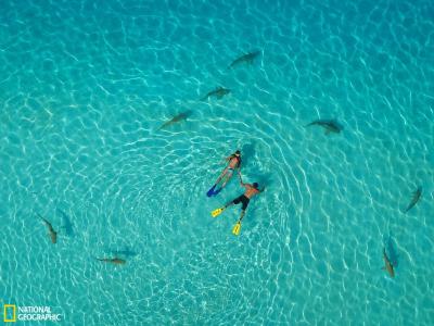 潜水爱好者与鲨鱼水中共舞