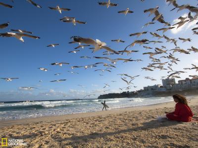 澳洲邦迪海滩 摄影师沿着澳洲邦迪海滩散步的时候看到了这个穿红衣服的女子,在一...