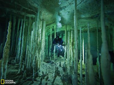 潜水员探秘阿巴科岛丹氏洞穴的石笋林