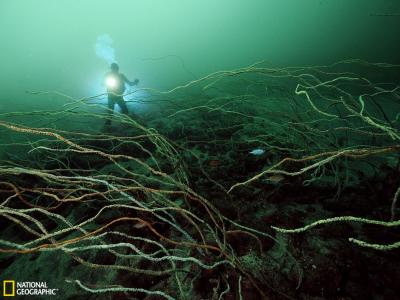 日本深水海鞭珊瑚 日本骏河湾的这些混杂纠缠的“线缆”实际上是一片深水海鞭珊瑚...