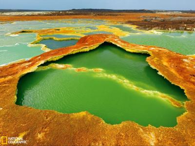 东非的温泉 东非的温泉,硫和藻类让温泉得以拥有绚烂的颜色。温泉的水由岩浆房冒...