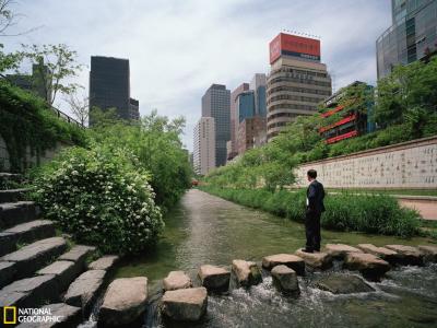 韩国首尔清溪川 韩国首尔,清溪川穿过市中心。清溪川长3.6英里(约合5.8公里),...