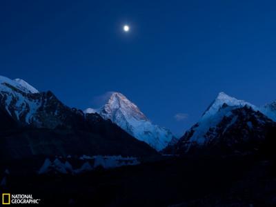 世界第二高峰K2山 世界第二高峰K2山的北侧,一轮明月高挂天空。