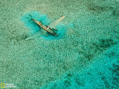 在搭乘一架赛斯纳C172飞越巴哈马群岛海域过程中,摄影师拍摄了这幅航拍照,展现一...