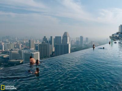 新加坡高楼无边际泳池 新加坡滨海湾金沙度假胜地的无边际泳池,整座城市的风光尽...