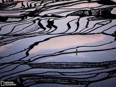 中国水稻梯田 黎明时分的中国水稻梯田,一位农民走在梯田里,开始忙碌的一天。