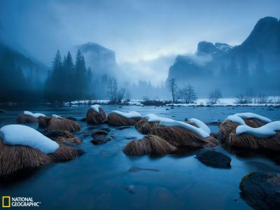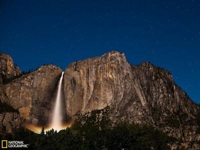 约塞米蒂谷月虹 这张30秒曝光的照片显示出隐藏在瀑布底部薄雾中的月虹。约塞米蒂...