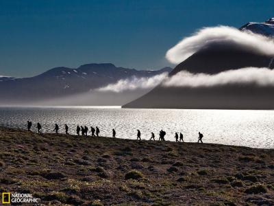 斯瓦尔巴特群岛的跋涉者 斯瓦尔巴特群岛北极苔原,一群旅行者在明媚的阳光下跋涉...