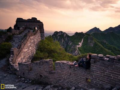 中国长城 一位妇女在北京箭扣长城上休息,这是古代中国长城的一部分。