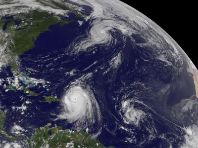 地球静止业务环境卫星拍摄的地球同时形成的三大风暴