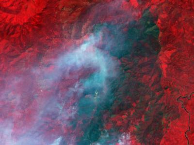 太空中拍摄的美国加利福尼亚州克拉马斯国家森林公园山火