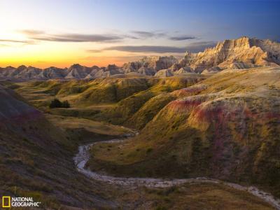 美国恶地国家公园日出 日出时分,恶地国家公园内“黄土堆”(Yellow Mounds)附...