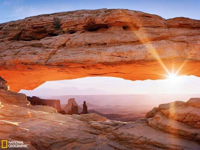 美国梅萨拱门日出 梅萨拱门位于美国犹他州的峡谷地国家公园内,是世界上观赏日出...