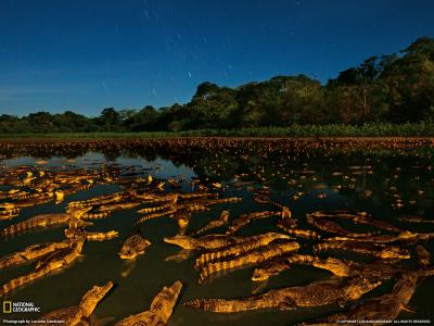 巴西河流里的一大群凯门鳄 傍晚时分,一大群凯门鳄出现在巴西的一条河流里,这一...