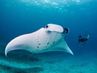 巨大的蝠鲼使潜水员相形见绌 在靠近巴厘岛的珀尼达岛海域,巨大的蝠鲼使潜水员相...