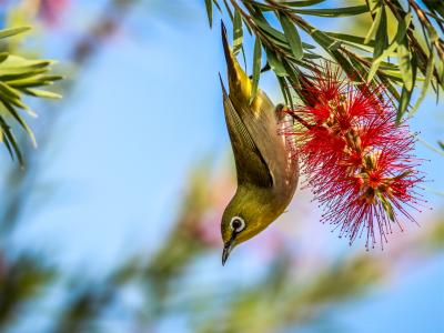 台湾暗绿绣眼鸟 图片拍摄于台湾,一只珍巧可爱的暗绿绣眼鸟出现在树枝末端。暗绿...