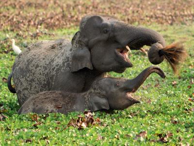 印度加济兰加国家公园的野生亚洲象 这些野生亚洲象生活在印度肥沃的加济兰加洪泛...