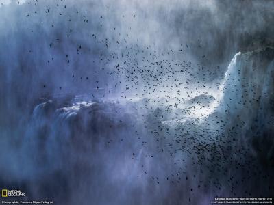一大群雨燕飞过伊瓜苏瀑布 这是一个无比壮丽的自然奇观。一大群雨燕飞过雄伟的伊...
