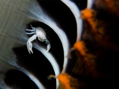 一只螃蟹躲藏在海笔的躯干中 这张图片是在一次夜潜中拍摄的,在水深25米的海底,...