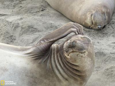 美国加州海滩上的海豹 在美国加利福尼亚州圣西蒙的海滩上,一头雌性象海豹正在挠...