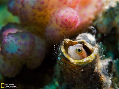 埃及红海珊瑚礁中的一条鳚鱼 埃及红海的珊瑚礁中,一条鳚鱼从珊瑚洞里探出头来,...