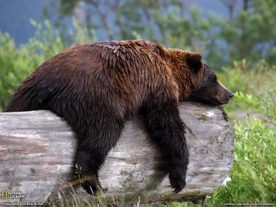 大灰熊趴在圆木上晒太阳