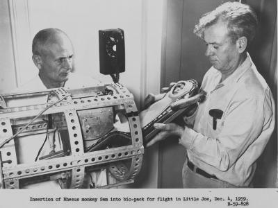 1960年1月21日,山姆小姐,一只恒河猴,被装入生物包中,用于测试美国宇航局水星飞...