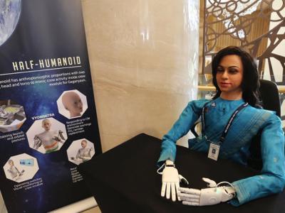 Vyommitra将升空测试太空飞行对人体的影响。Vyommitra跟出席记者会的人握手。Vyomm...