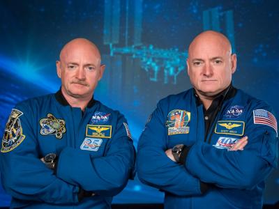 航天员史考特. 凯利(右)在准备前往国际太空站执行为期一年...