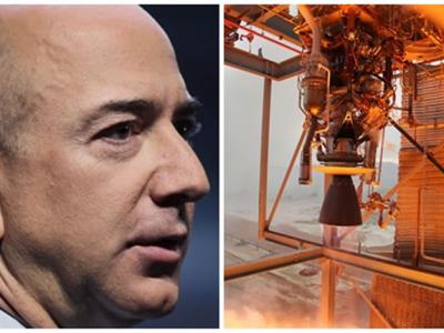 贝索斯(左)成立的太空科技公司研发的火箭引擎,已装配在火箭上(右)。 BE-...