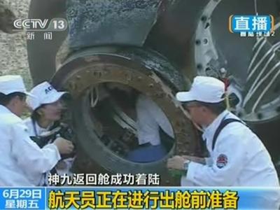 航天员正进行出舱前准备 工作人员正在打开返回舱 神舟九号返回舱着陆 北京...
