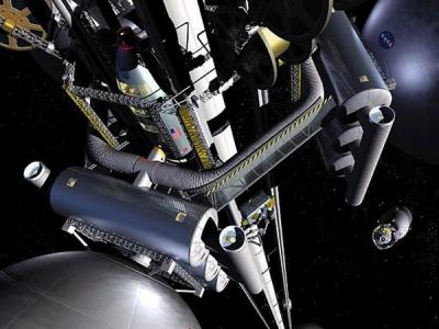 艺术家描绘的太空电梯:日前日本工程师计划40年内建造太空电梯,可一次性携载30名...