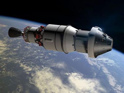 轨道中的“猎户座”飞船 任务结束后,飞船携带着3个巨大的降落伞最终溅落在位...