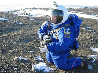 一名宇航员正穿着将在火星上使用的“奇异”NDX1太空服,在南极洲阿根廷马兰比奥(...