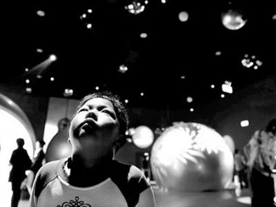 上海8岁儿童曹启承在世博会太空家园馆内仰望“太空” 新华社记者李紫恒摄 “江畔...