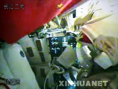 9月26日23时34分54秒,航天员翟志刚、刘伯明在神舟七号飞船轨道舱内试穿舱外航天...