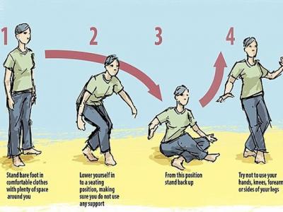巴西医学家研究出SRT测试,以简单的蹲立动作评估身体状况。 研究指人的身体柔...