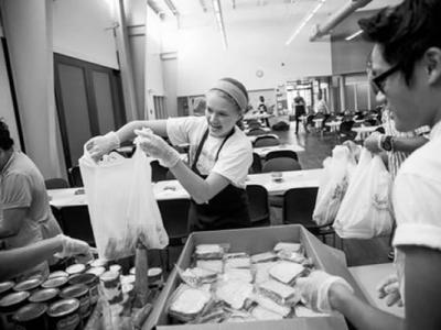 一位志愿者在新泽西州卡姆登的大教堂厨房为流浪者打包食物 (神秘的地球uux.cn)...