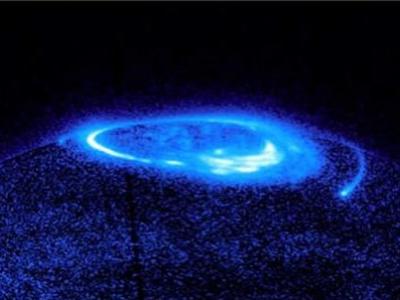 2007年2月哈勃太空望远镜上的先进巡天相机拍摄到的木星北极上空紫外线极光的图片...