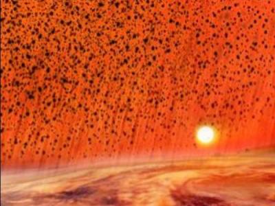 艺术家绘制的HD 209458b热木行星上飘着“热雪”与黑烟粒的情景 科学家发现了一个...