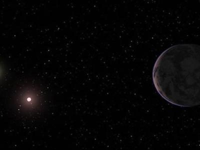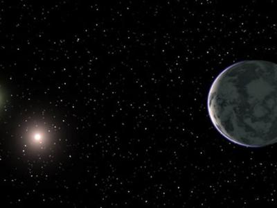 艺术家绘制的该类地行星所在的三星系统,其他两颗恒星是橙矮星 从太空角度观看...