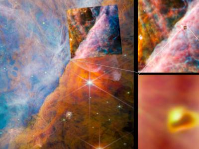 詹姆斯·韦伯太空望远镜仪器NIRCam(左)、MIRI(右上)和两者结合(右下)拍摄的猎户座星...