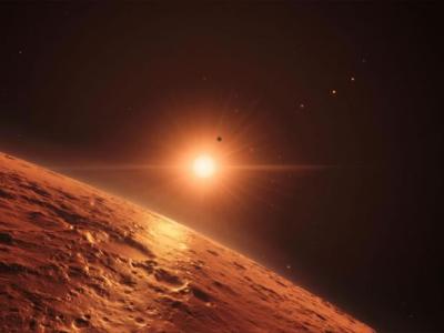 这幅绘图想像从TRAPPIST-1恒星系统中的一颗行星往外...