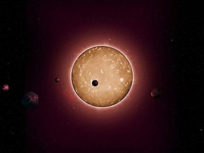 这是艺术家描绘的Kepler-444恒星,及其环绕的5颗行星,科学家推测称,这个远古行...