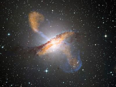 这是从半人马座A星系中心的黑洞喷发出的物质和无线放射波瓣 这个巨大黑洞向外...